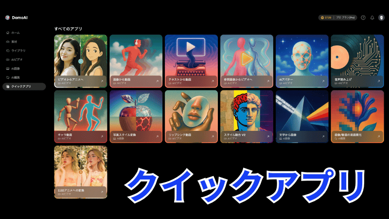 サイドメニューにはメイン機能の他にストック素材や「クイックアプリ」機能が表示されます。