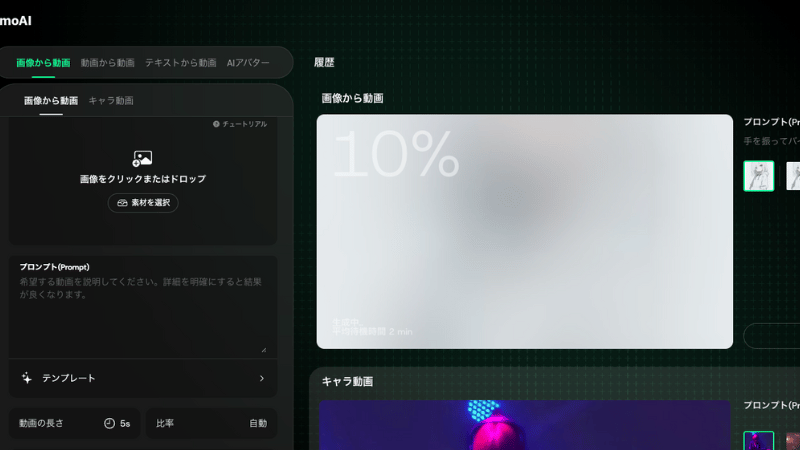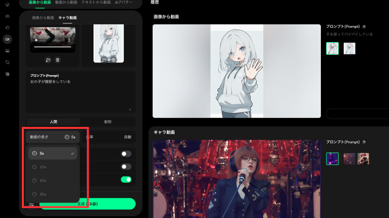 また動画と画像をミックスさせる「キャラ動画」では5〜30秒が生成可能です。