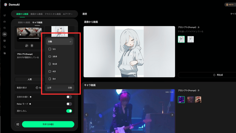 DomoAIの「画像から動画」と「キャラ動画」の特徴
