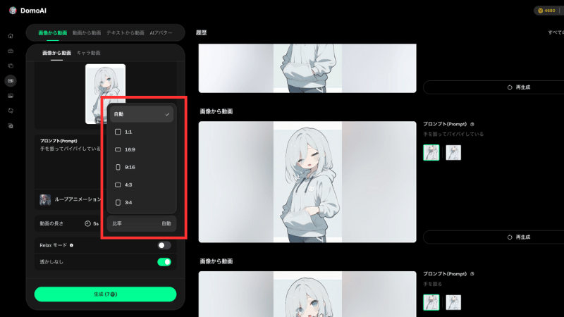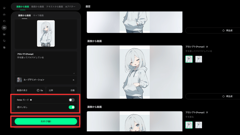 最後に動画サイズの比率、Relaxモード(クレジット消費なし)、透かしロゴを消すかの設定をして生成します。