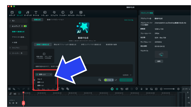選択したら生成モードをVeo3か標準の選択をします(選択は①と③の場合のみ)