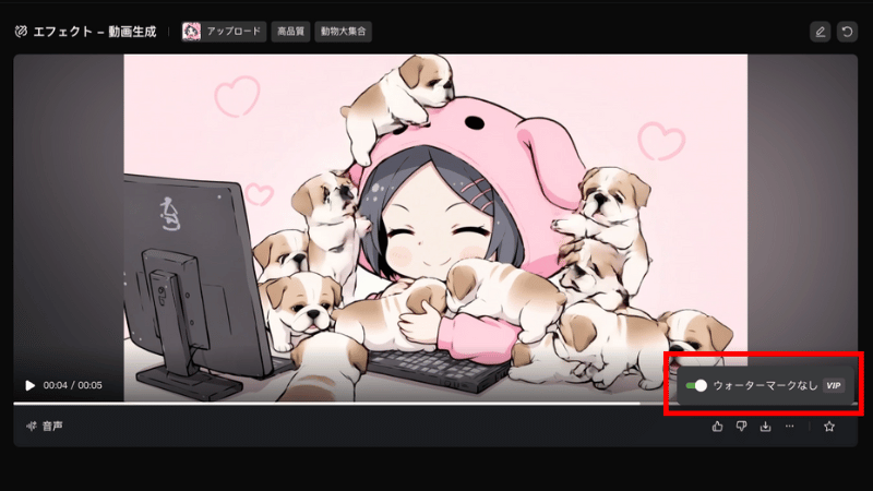 一番注意しなければいけないのが、無料クレジットで生成した透かしロゴ(ウォーターマーク)ありの動画では商用利用ができない点です。