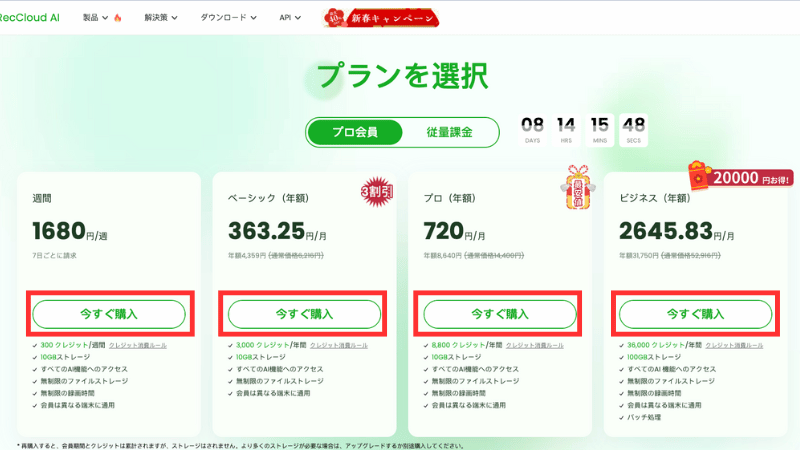 すると、RecCloud AIの料金プランが4種類表示されるので、自分に合ったプランの『今すぐ購入』をクリックしましょう。