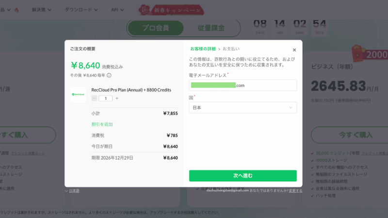 RecCloud AI(レッククラウド)のプランを選択すると「ご注文の概要」がポップアップ表示されます。