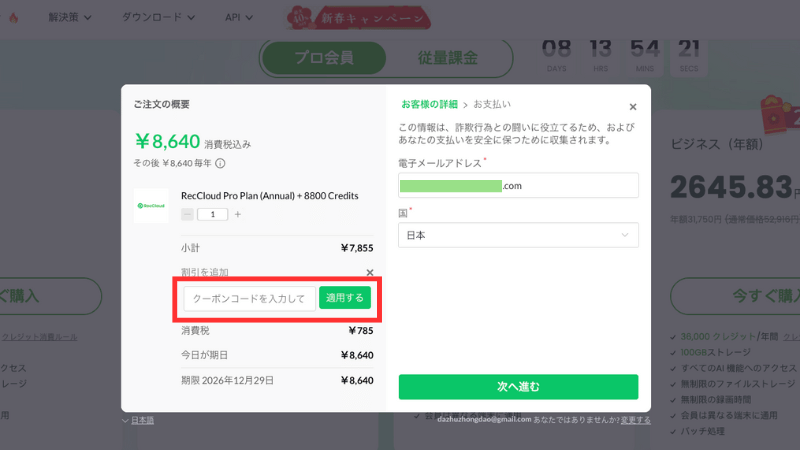 ここではRecCloud AI(レッククラウド)のクーポン利用手順を画像付きで解説します。
