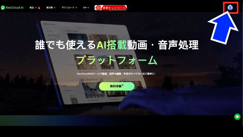 まずはRecCloud AI(レッククラウド)の公式サイトにアクセスしましょう。